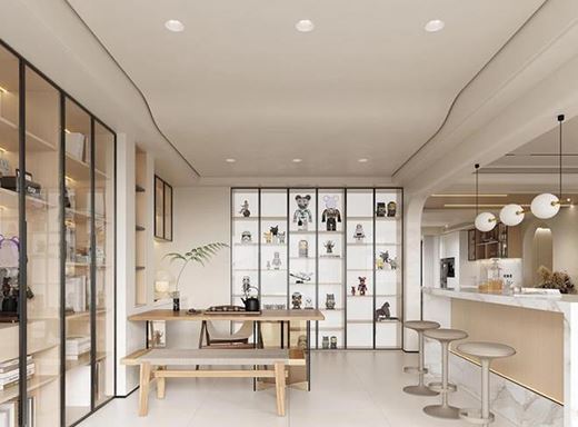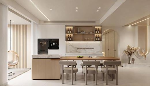 奶油風的餐廳,往往會帶著幾分侘寂風的感覺,木質(zhì)餐桌與珊瑚絨的餐椅相搭配,質(zhì)感溫馨舒適。餐邊的設(shè)計,加上隱形燈帶增加餐廳柔和。