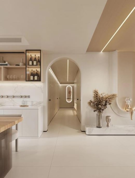 在硬裝上通過打造圓弧型門洞,在過道設(shè)計嵌入式燈帶。