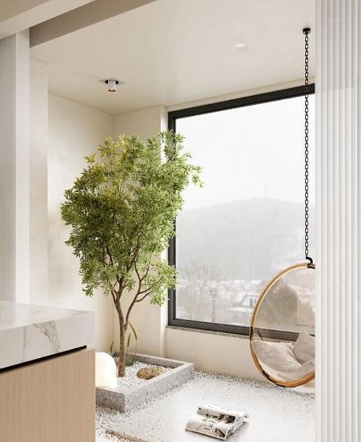 餐廳靠窗位置設(shè)計一個吊椅,進行休閑、閱讀、觀賞風景。