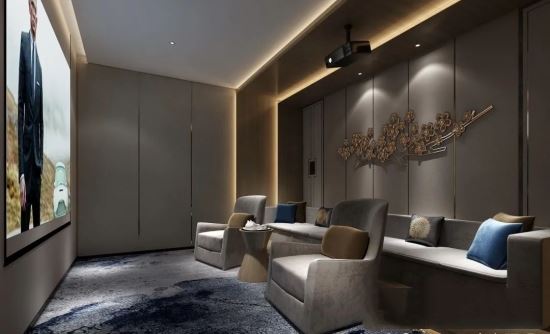 別墅影音室的燈光要配合影片的情節,才能更貼合實際的影院效果,讓人有種在電影院的感覺,所以我們應該以氛圍照明為主,突出熒幕的內容。暗藏燈槽+射燈+低位照明的組合方式,滿足氛圍光的同時,可以照亮腳下,提供清掃影音室所需的照明。