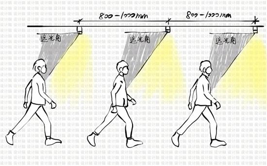 將燈具的光束角以及人的行走動線結合考慮,筒燈的間距一般在800mm-1000mm,每個人對光的感受和感知程度是各不同的,因此,這個筒燈的間距,可以根據實際情況和客戶需求進行延長。從動線的角度來分析,才能保證人眼在空間走動的過程中都是處于遮光角區域內,避免光束的刺眼引起的不適感,也不影響燈光在空間中的照明效果。