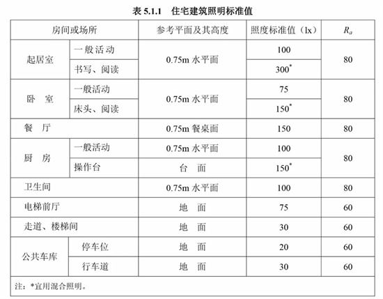 02.如何計算筒燈數量?“空間照的亮不亮” 就是環境能滿足空間內所有活動所需要的最基礎的照度。即單位面積上光的多少(單位是流明,縮寫為Im) 叫照度(單位勒克斯,縮寫x.1=1m/mec),按照GB50034-2013國家建筑照明設計標準,對家居不同空間的舒適照度有明確的指標,比方說,客廳的一般活動需要100lx的照度;臥室的一般活動需要75lx的照度;廚房的照度則需要75lx等,具體區域照度標準值如下圖所示。