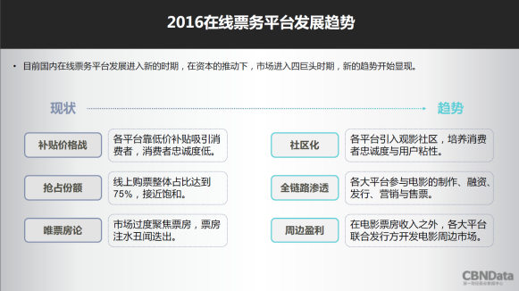 隨著以電影為代表的文化產(chǎn)業(yè)的發(fā)展,在線票務(wù)平臺(tái)作為生活?yuàn)蕵?lè)的流量入口成為各大巨頭的“必爭(zhēng)之地”。在在線票務(wù)市場(chǎng)已經(jīng)接近飽和的今天,在線票務(wù)平臺(tái)的目標(biāo)早已不局限于“賣好電影票”。越來(lái)越多的在線票務(wù)平臺(tái)也在思考,要如何挖掘更多消費(fèi)空間,實(shí)現(xiàn)消費(fèi)內(nèi)容的多維變現(xiàn),獲得更全面的用戶泛娛樂(lè)消費(fèi)數(shù)據(jù),才能更好地布局互聯(lián)網(wǎng)+市場(chǎng),深入泛娛樂(lè)產(chǎn)業(yè)鏈條。而從淘票票2016年上半年交出的“成績(jī)單”,我們也不難看出,淘票票無(wú)疑已經(jīng)走在了前端。
