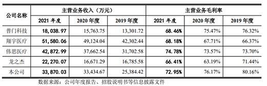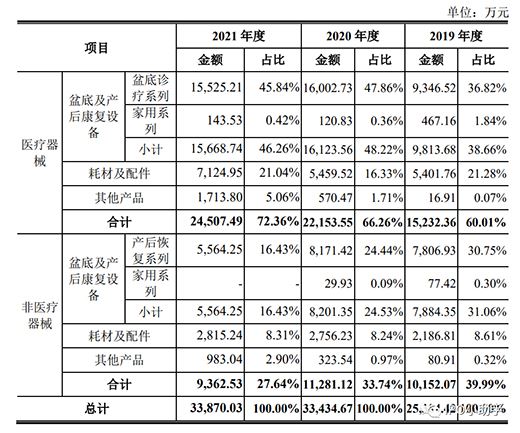 麥瀾德的主營業務收入情況如下表所示,2021年的營收和去年相比幾乎沒有變化,醫療器械類的盆底及產后康復設備一直是最主要的收入來源。