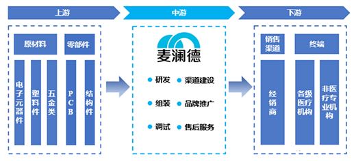 它在產業鏈里處于中游位置,上游是電子元器件、PCB、塑膠件、結構件及五金件等生產行業,下游是各級醫療機構以及月子中心、產后恢復中心、母嬰中心等專業機構。