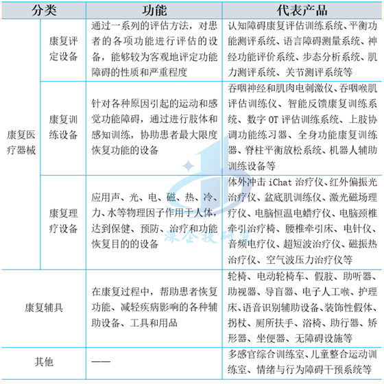 按作用機(jī)理分,康復(fù)器械主要產(chǎn)品涵蓋聲療、光療、電療、磁療、中醫(yī)類(lèi)、壓力療法、運(yùn)動(dòng)訓(xùn)練(PT)、作業(yè)訓(xùn)練(OT)等。按照作用方式的不同,又可分康復(fù)理療設(shè)備(物理治療設(shè)備)、康復(fù)訓(xùn)練設(shè)備、康復(fù)評(píng)定設(shè)備等。廣義的康復(fù)器械還包括康復(fù)輔具等,如下表所示。