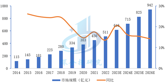 我國(guó)康復(fù)醫(yī)療器械市場(chǎng)規(guī)模持續(xù)擴(kuò)大。根據(jù)Frost&Sullivan數(shù)據(jù),2022年中國(guó)康復(fù)醫(yī)療器械市場(chǎng)規(guī)模為511億元,預(yù)計(jì)2026年達(dá)到941.5億元。