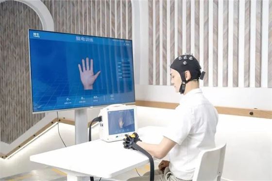 不需要開顱,不需要做侵入式的創傷手術,使用“羿生腦機接口康復訓練與評估系統”,患者只需佩戴腦電帽,就可以用意念“操控”手腕、手指等來進行康復訓練。該系統是國內首款獲得醫療器械注冊證并實現臨床落地的腦機接口軟體手功能康復機器人。