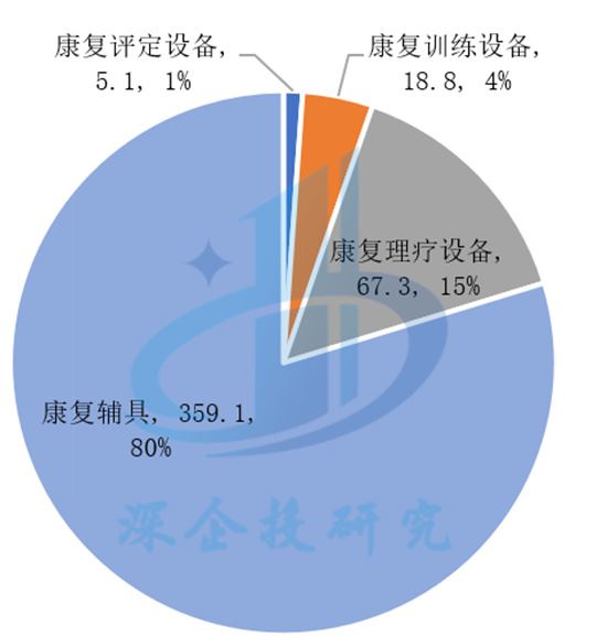 從市場結構來看,康復輔具占據主體。根據Frost&Sullivan數據,2021年我國康復醫療器械市場中,康復測評、訓練及理療三類設備市場規模合計91.2億元,占比為20%左右,市場以輪椅、假肢、助聽器、無障礙設施等康復輔具為主,如下圖所示。
