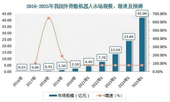 從市場規模看,2016-2020年我國外骨骼機器人市場規模由0.03億元增長至2.5億元。隨著外骨骼機器人行業產品性能的提升和下游需求增長,預計2025年我國外骨骼機器人市場規模將達42億元。