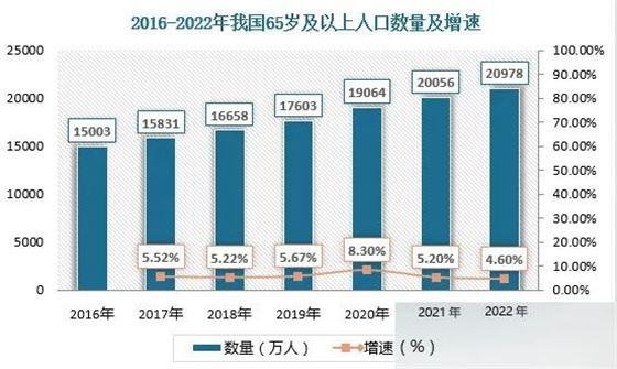 目前,我國有2.5億老年人,4000萬失能半失能老年人。隨著老齡化程度加深,“十四五”時期我國將進入中度老齡化階段。根據數據顯示,2016-2022年我國65歲及以上人口數量由15003萬人增長至20978萬人。