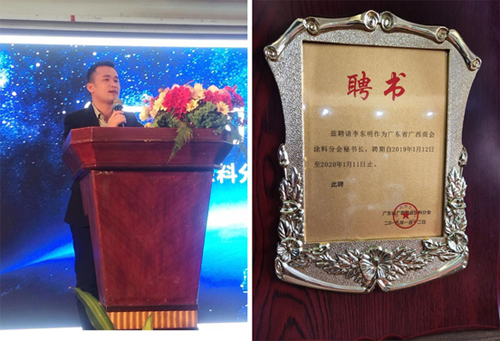 2019年,廣東省廣西商會涂料分會邀請了君匠世家藝術壁材總經理李東明先生擔任秘書長一職。在其后的一年內,李總參與籌劃商會各類活動,攜手各成員團結互助,共同應對國內涂料市場的變化挑戰,關心和支持家鄉建設,促進涂料行業朝著健康良性的方向快速發展。