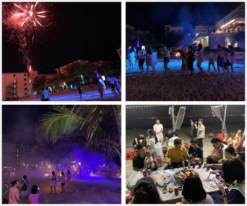 到了晚上,海邊依然熱鬧非凡,煙花沖天綻放鋪墊華美夜景,人群中載歌載舞。君匠世家團隊親密地圍坐一起,品嘗當地特色的海鮮盆菜,舉辦海灘燒烤宴和篝火晚會,相互交談著走南往北的人生經歷,不同話題的交流切入加深對彼此的了解。