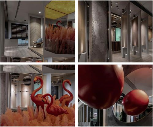 一個好的店面形象,關系到顧客的心理感受以及對品牌的印象。泰詩爾全新專賣店整體以現代輕奢風為主,大膽的用色交相輝映,錯落有致的裝飾陳列,并融入了火烈鳥等潮流元素作為精致格調的點綴,凸顯時尚質感的同時給人留出了許多想象空間,讓客人一眼難忘,仿佛置身于一座藝術館。