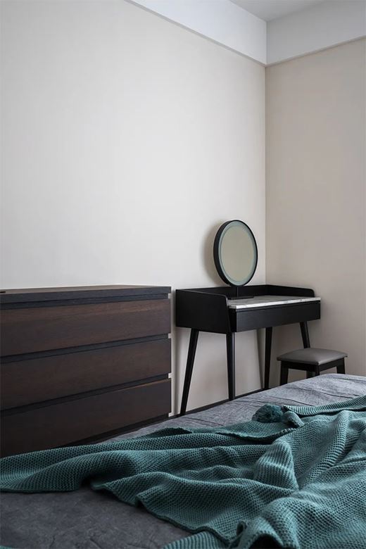 ▲床尾布置一個斗柜,角落處還有一張小梳妝臺,為主人提供了一個端莊舒適的休息、梳妝的臥室空間。