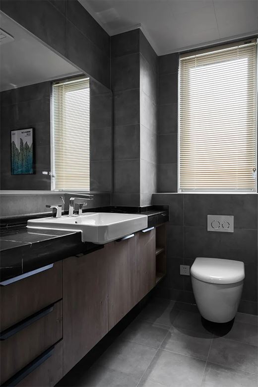 ▲另一個衛(wèi)生間也是采取同樣的灰色瓷磚+灰木色浴室柜設(shè)計,不同的布局也搭配出了類似的空間氛圍。