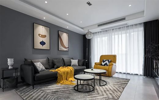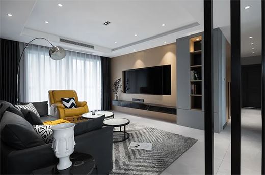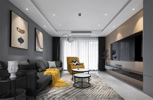 ▲客廳現(xiàn)代風的基礎(chǔ),天花采取無主燈的吊平頂設(shè)計,灰色沙發(fā)墻與布藝沙發(fā)、地毯等軟裝,電視墻這是木質(zhì)感定制的設(shè)計,加入黃色皮沙發(fā)椅與毯子,帶來一種簡約而又有活力的空間氣息。