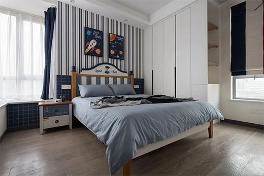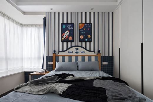 ▲兒童房的床頭墻貼著藍白豎紋的墻布,掛上兩幅太空主題的裝飾畫,擺上一張兒童床+灰色床單,使得兒童房空間也是顯得童趣舒適而清新愜意。