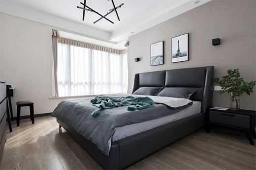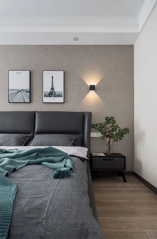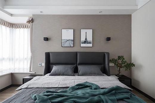 ▲咖灰色調(diào)的床頭墻上,掛上兩幅黑白調(diào)的裝飾畫,左右側(cè)黑色床頭柜上裝著黑色小壁燈,整個空間簡潔而不失現(xiàn)代設(shè)計感。