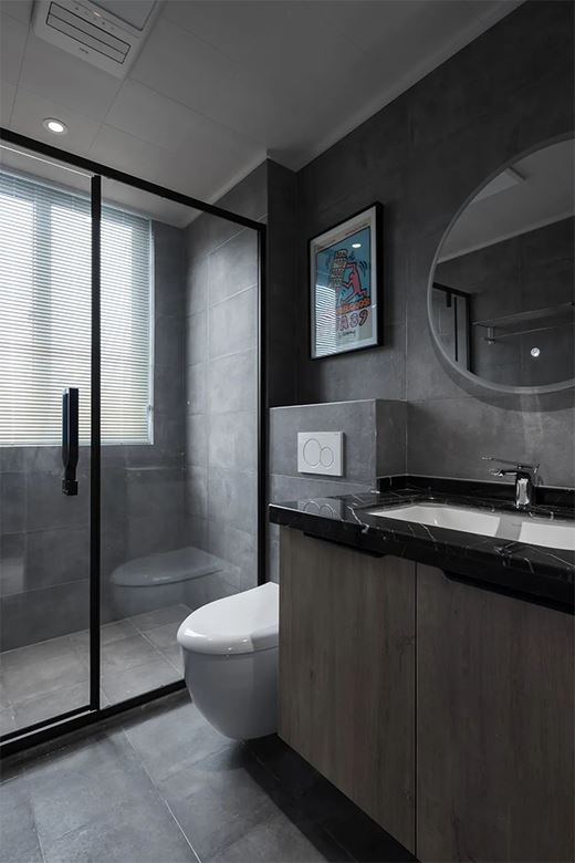 ▲衛(wèi)生間里面是灰色的地磚與墻磚,,壁掛馬桶后方做了一個小墻臺,裝上灰木色浴室柜+黑色洗手盆,還有圓形的浴室鏡,整個衛(wèi)浴空間顯得簡約精致而實用時尚。