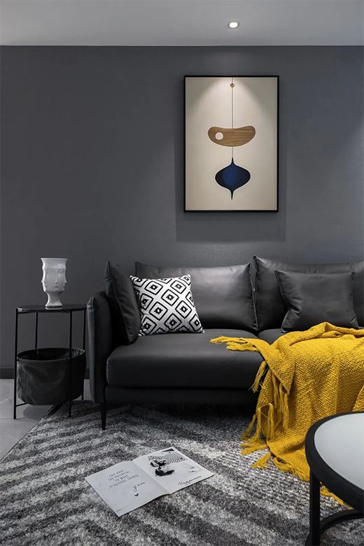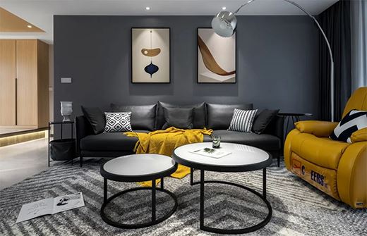 ▲深灰色沙發(fā)墻,掛上兩幅抽象裝飾畫,擺上深灰色布藝沙發(fā)、兩張圓形的石材茶幾組合,邊上一盞落地燈,使得空間充滿低調(diào)高級的氛圍感。