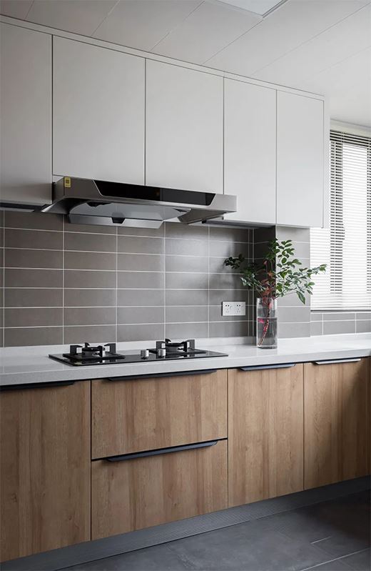 ▲廚房以灰色的地面與墻面磚,裝上原木色的櫥柜+白色的操作臺面,窗戶裝著百葉簾,為主人營造了一個簡約舒適而明亮清新的烹飪空間。