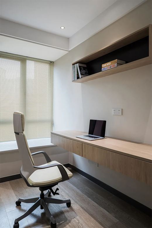 ▲書房裝上懸空書桌與書架,擺上一張休閑辦公椅,還有飄窗與百葉簾的設(shè)計,為主人打造了一個實用舒適的書房區(qū)域。