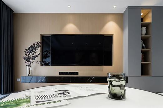 ▲電視墻以木飾面的定制,中間留空電視機的壁掛安裝位置,裝上黑色懸空的電視柜,右側(cè)是灰色的收納柜+書架展示架,整個電視墻給人一種現(xiàn)代簡約而實用的高級效果。