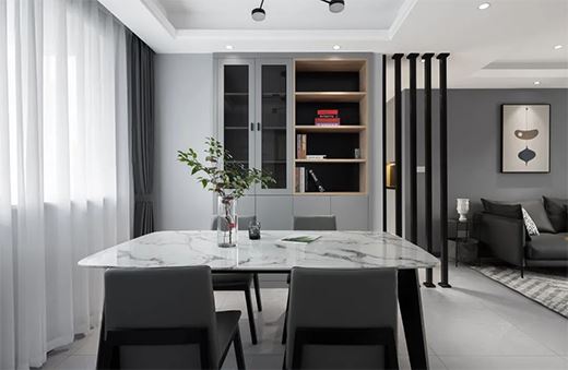 ▲餐廳左側(cè)是廚房門,右側(cè)定制一個入墻式的餐邊柜,中間擺上黑白配的餐桌+灰色皮藝餐椅,簡潔時尚與現(xiàn)代的氛圍格調(diào)充滿了整個餐廳空間。
