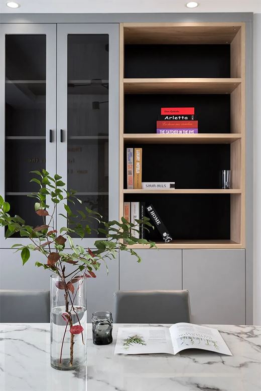 ▲餐桌上擺著玻璃花瓶,后方餐邊柜上擺著書籍,整個用餐空間給人一種清新舒適的文藝與精致感。