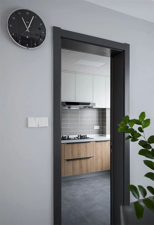 ▲廚房門口旁邊的墻面掛著一個黑色的時鐘,在現(xiàn)代簡潔的餐廳空間下,呈現(xiàn)出一種自然舒適的高級設(shè)計感。
