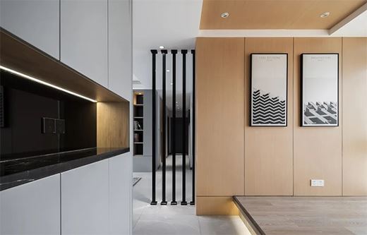▲玄關(guān)左側(cè)是定制鞋柜,右側(cè)是抬高的地臺,針對大門的過道裝了一道黑色格柵屏風,使得空間感舒適優(yōu)雅而又私密。