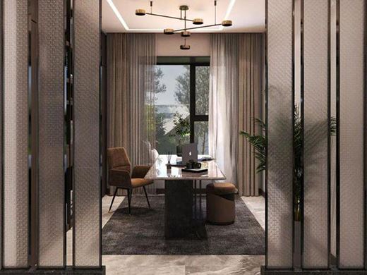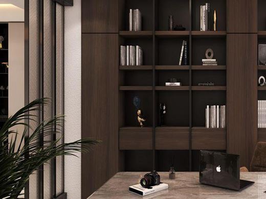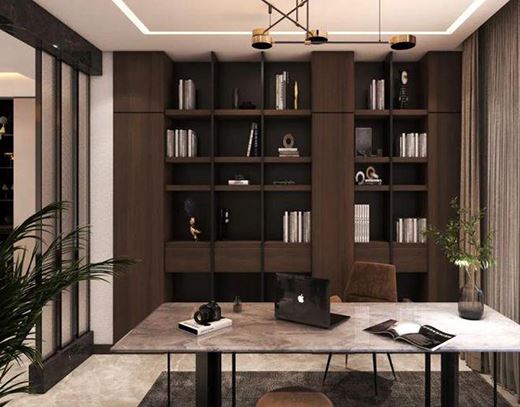 書房與客廳一樣是象征著主人的品味與身份的重要場所,深褐色的書柜搭配墻面與屋頂,完美露出了書房獨有的藝術氣息,讓整片空間都顯得大氣典雅。