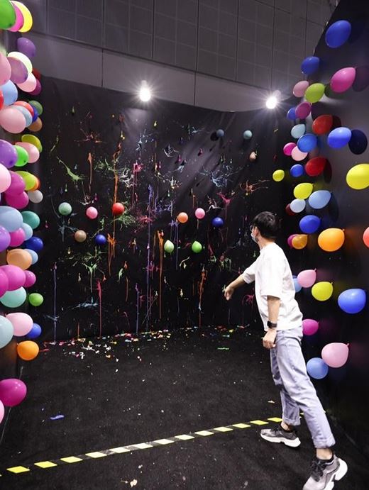而在“互動創作區”,觀展者可以暢游解壓宇宙,用飛鏢擊落包裹乳膠漆的氣球,共同構建這個空間內的“藝術盛舉”。