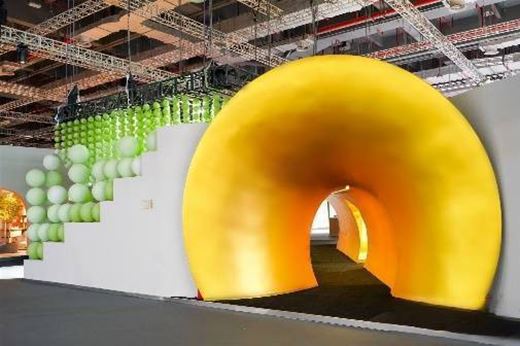 在立邦展館中,首先映入眼簾的便是使用了立邦今年重磅推出的23年趨勢色“碎金”,所打造的喇叭狀“神奇通道”,亮眼的金黃色和夸張的造型,讓其瞬間成為家博會上的焦點。