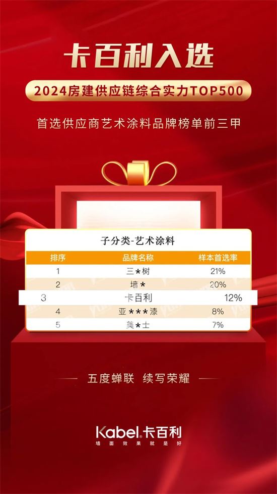 最近,備受矚目的《2024房建供應鏈企業綜合實力TOP500-首選供應商服務商測評報告》在北京隆重揭曉。卡百利憑借卓越的綜合實力,以高達12%的品牌首選指數,成功躋身“2024房建供應鏈綜合實力TOP500首選供應商——藝術涂料類”前三甲的行列,再次彰顯了其在行業內的領先地位。