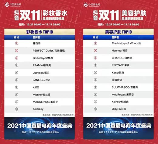 值得注意的是,雙11之際,當天貓銷量榜單被國際大牌占據時,在抖音與快手直播電商平臺上,美妝國貨卻完勝國際大牌,成績令人眼前一亮。
