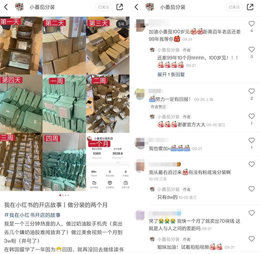 類似的例子還有“小番茄分裝”,原本三分鐘熱度的店主在很多用戶的鼓勵下,調整心態,將店鋪經營堅持下去,并持續帶來更多正品分裝產品。