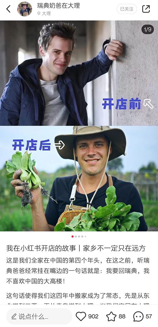 比如來自瑞典、旅居多年、最終在大理定居賣有機食品的小紅書商家“瑞典奶爸在大理”,他就把自己當做一個普通的小紅書用戶,在筆記中分享自己旅居、種地等經歷,與粉絲進行平等的交流,他還把自己在小紅書開店的故事也進行了真實分享。