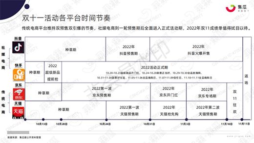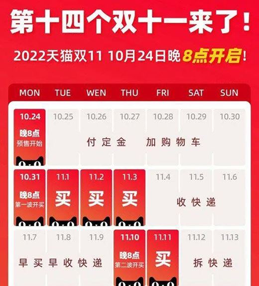 不同平臺雙十一活動的開始時間會有略微不同,但是基本上都集中在十月下旬。今年天貓的雙11全球狂歡季就宣布將于10月24日晚8點開啟預售,并且整個活動持續(xù)到11月13日。京東的雙十一活動則是從10月20日開始持續(xù)到11月13日。根據(jù)這個活動時間安排,各個品牌可以提前進行營銷布局。