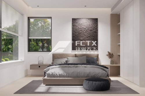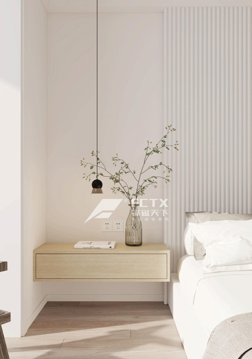 臥室強調的是溫馨,傳統的頂上一個吸頂燈的負重感不再存在,無主燈設計更加輕便自然,讓睡眠更輕松