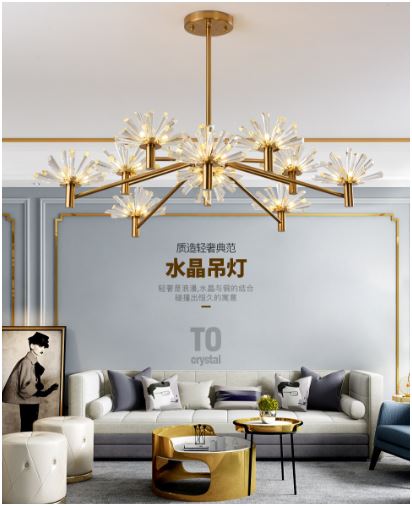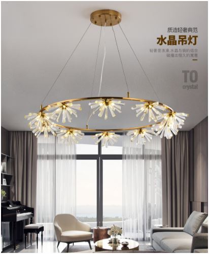 大明照明對白系列吊燈LGXH001/03001,集鐵藝五金吸頂盤、電鍍厚實燈架及全水晶輕奢燈體于一體,打造出璀璨如流光、純凈如雪花的精巧造型,故被命名為“流光雪花”。