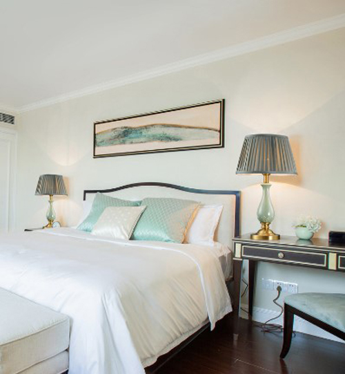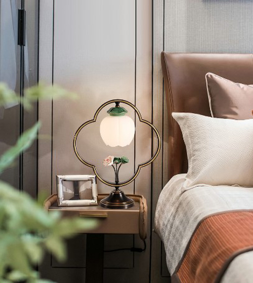 大明照明T090/01122臺(tái)燈,全銅外觀,輔以陶瓷蓮花荷葉的點(diǎn)綴,色澤亮麗,富有質(zhì)感,盡顯古典大氣之美。將其放置于床頭柜上,和顏色與暖光相近的床上三件套相互輝映,一床一燈,和諧舒適。仿若只要我們躺在床上,閉上眼睛放松身心,便能聽到魚兒在水中暢游、在荷葉下嬉戲的輕微聲響,迷迷糊糊間竟也有了躺在池塘邊休息的錯(cuò)覺。