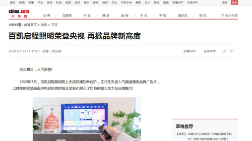 由代表中國名聲和形象的國家級門戶網站《中華網》報道的這一篇文章,以一個醒目的標題《百凱啟程照明榮登央視 再掀品牌新高度》成功吸引了一大批網友的注意。文章既明確傳達了百凱啟程照明曾在央視人氣頻道播出品牌廣告片的信息,又側面透露出百凱啟程品牌的強勁綜合實力,讓閱讀過文章的網友對百凱啟程有了更多的好感與消費欲望。