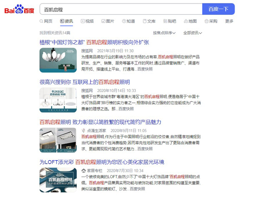 通過百度、360、搜狗等搜索引擎,我們輕易便能找到百凱啟程照明品牌的身影。由于時間關系,我們今天就暫且不看其他內容,先把目光聚焦到百度資訊上。