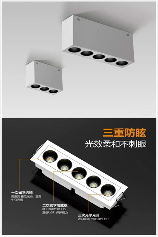 對于層高比較充足的戶型,可以做吊頂,A8系列格柵燈,精致小巧,深度防眩,充分表達了什么叫做“見光不見燈”,布局在頂部,讓家居空間更加均勻舒適,而且空間視覺感也會更加簡潔大方。