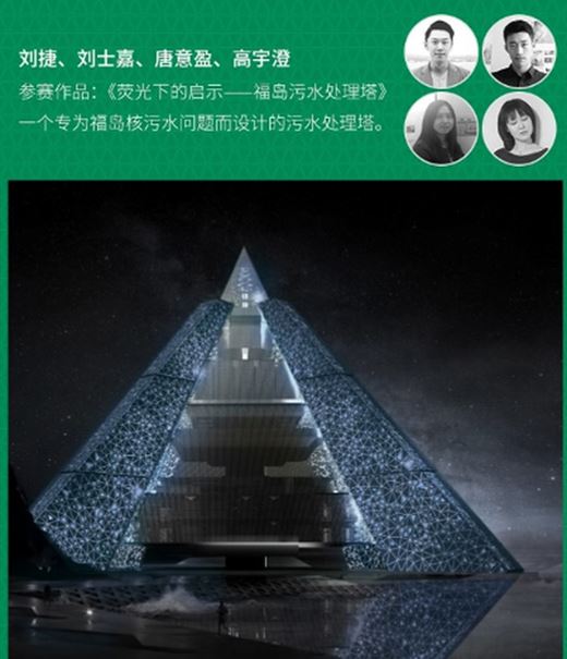 最終職業組劉捷、劉士嘉、唐意盈、高宇澄團隊憑借作品《熒光下的啟示-福島污水處理塔》贏得了總決賽職業組冠軍。該作品設想通過放射性水處理系統轉化成電能,以及利用三氧化鈦的放射性制造熒光,用點點熒光呼吁人類提高對核污染的認知,警惕真正核災難的來臨。