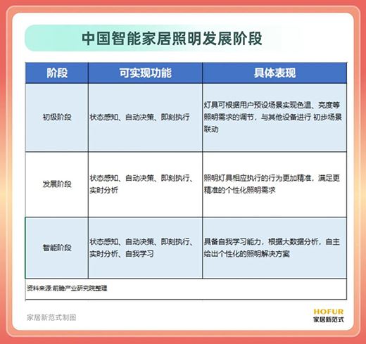從智能家居照明的發展階段來劃分,大致可分為初級、發展及智能階段,即從按鍵遙控這種物理形式,經過手機 APP、語音、隔空體感或視覺等控制的過渡階段,最終達到系統自主學習的無感體驗,而目前國內的智能照明大多仍處于發展中階段。