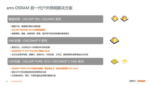 艾邁斯歐司朗資深市場專員陳嘉華表示,會根據不同的照明場合,提供不同的高性能或高性價比方案給到客戶。針對戶外照明,按照產品的封裝系列來,主要分為三種類型。