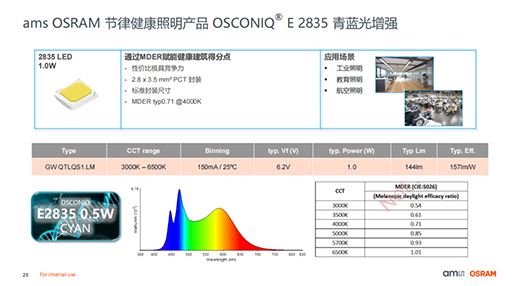 基于此原理,艾邁斯歐司朗推出了新一代的節律健康照明產品,OSCONIQ® E 2835青藍光增強,Cyan Enhanced,可以有效改善MDER值。以典型值4000K CCT為例,該產品能夠實現MDER值達到0.71。
